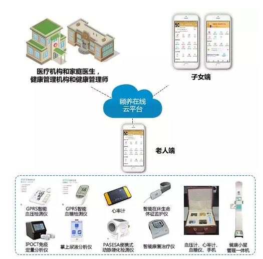 系統由雲平台、老(lǎo)人(rén)端、子(zǐ)女(nǚ)端及醫(yī)療機(jī)構、康複機(jī)構、家(jiā)庭醫(yī)生(shēng)、健康管理(lǐ)機(jī)構和(hé)健康管理(lǐ)師(shī)組β成。