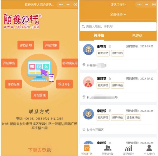 系統提供PC端和(hé)手機(jī)端應用(yòng),包括評估對(duì)象管理(lǐ)、照(zhào)護需求評估、生(shεēng)活環境評估、制(zhì)定照(zhào)護計(jì)劃、評估報(bào)告、評估模闆管理(lǐ)、區(qū)域分÷(fēn)組管理(lǐ)等功能(néng)。可(kě)滿足政府摸底、養老(lǎo)機(jī)構服務前綜合評估以及老(lǎo)人(rén)定期評估等場(chǎng)景需求。