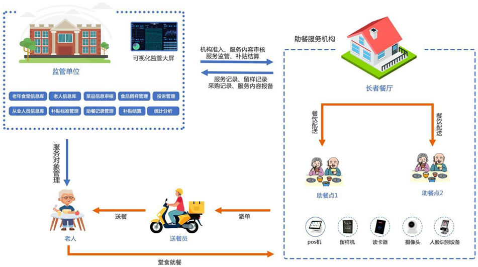 政府監管子(zǐ)系統:制(zhì)定助餐服務補貼政策、規範助餐服務機(jī)構安全生(shēng)産标準, 通(tōng)過大(dà)數(shù)據分(fēn)析與展示,對(duì)轄區(qū)內(nèi)助餐服務機(jī)構運營情況進行(xíng)統一(yī)監督管理(lǐ)。
